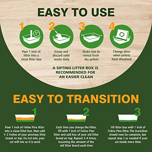 • A NATURAL CAT LITTER CHOICE. No new trees are cut down to make the pine shavings in Feline Pine Platinum Natural Pine Non-Clumping Litter. This cat litter comes from kiln dried shavings reclaimed from lumber production, so it’s a kitty litter that respects our precious natural resources.