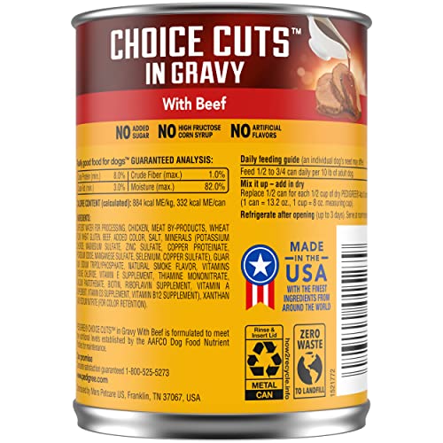 Details: PEDIGREE CHOICE CUTS IN GRAVY soft, wet dog food with beef gives your dog the flavors they crave with the nutrition they need. Your adult dog can enjoy the delicious taste of real beef and delectable gravy sauce in every bite with our hearty wet dog food. PEDIGREE formulas provide the perfect balance of vitamins and minerals with no artificial flavor, no added sugar, and no high fructose corn syrup. Each recipe is balanced for adult dogs, so you know they are getting the most from their wet dog food. You can serve this dog food as a topper, mixer or on its own. Any way you serve it up, PEDIGREE canned dog food can help your dog grow happy and healthy.